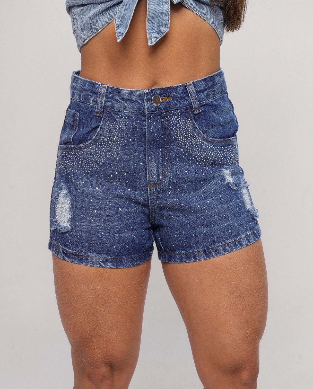 O short perfeito para quem ama unir estilo, atitude e um toque de glamour! Confeccionado em jeans de lavagem escura, esse modelo de cintura alta valoriza a silhueta e garante um caimento moderno e confortável. As aplicações de strass e pontos de brilho trazem destaque especial à peça, elevando o visual e deixando o look ainda mais fashion.