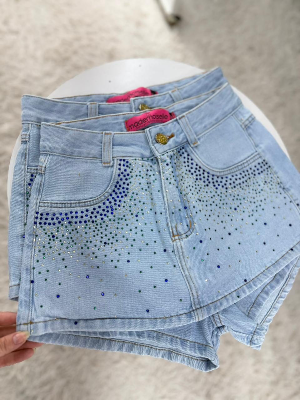 Com cintura alta que valoriza a silhueta, ele traz lavagem clara super versátil e aplicações de strass inspiradas no Brasil, garantindo um efeito luminoso e diferenciado no look. O modelo short saia oferece segurança e praticidade, sem abrir mão do charme.